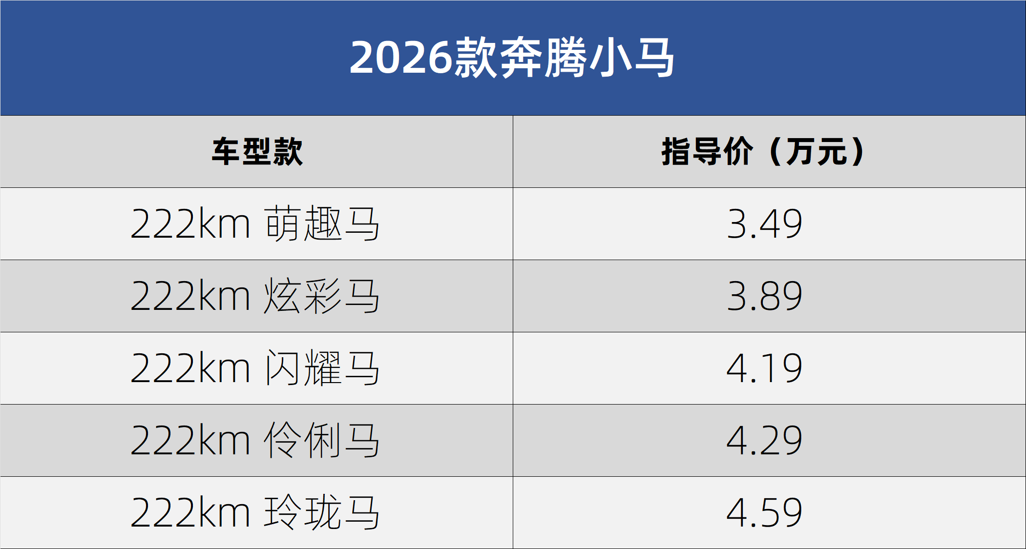 2025年7月27日,在吉林长春举行的中国一汽奔腾粉丝纳凉节上,2026款奔腾小马正式上市。新车推出5个车款供选,整体指导价区间为3.49-4.59万元。新车定位一款三门四座的微型电动汽车,此次升级对配置进行了调整,续航里程全部标配222km,并新增雪樱粉车色和可可棕内饰供选,更显可爱。