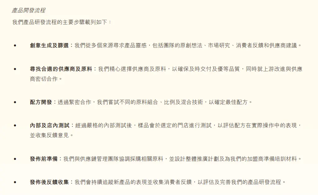 古茗在2024年财报中披露了自己的产品开发流程,包含创意生成及筛选、寻找合适的供应商及原料、配方开发、内部及店内测试盒发布后反馈收集六步。