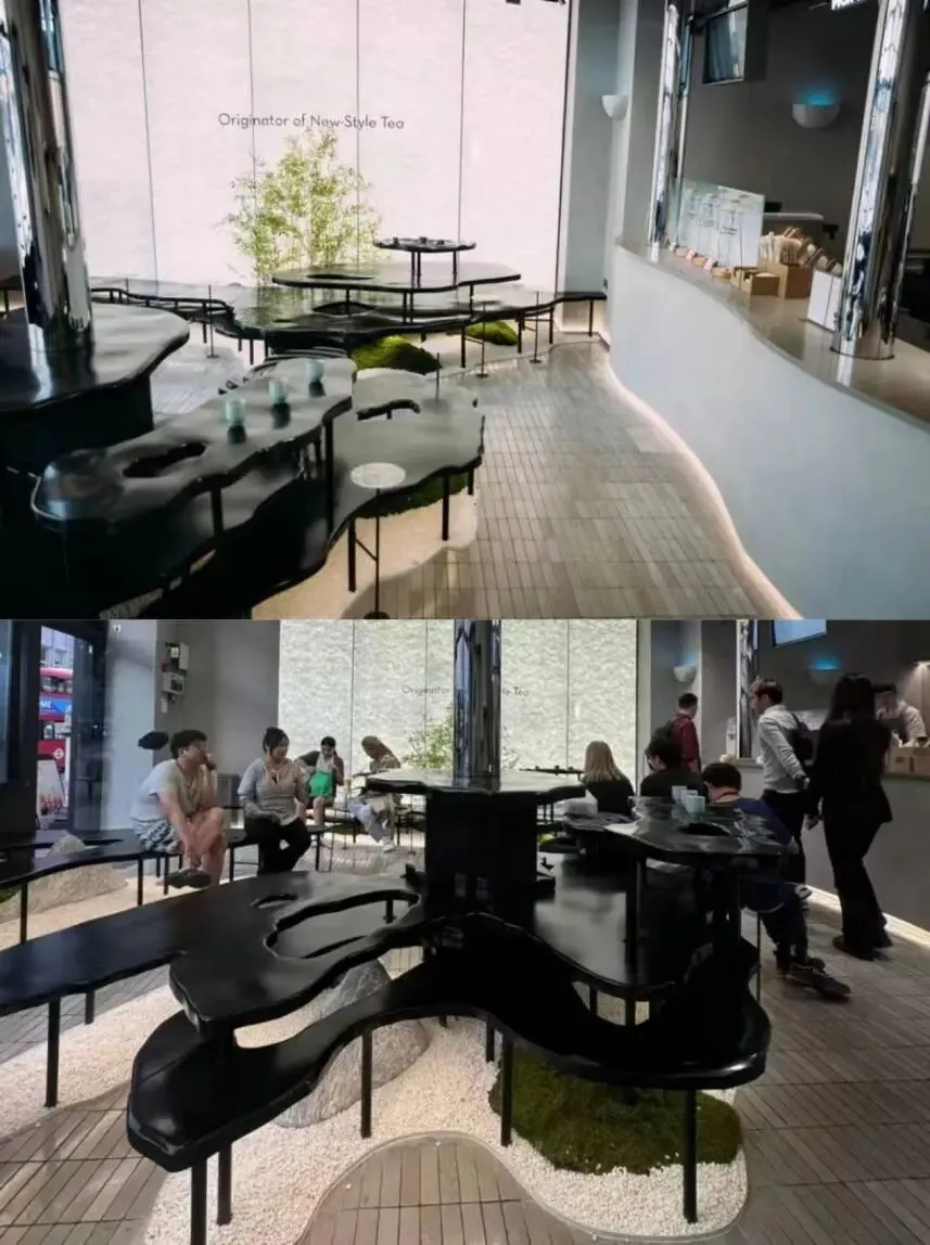 在产品以外,门店的装饰装潢也成为宣传中国文化的重要组成部分。以喜茶为例,其在全球多地的门店都极具设计感:伦敦New Oxford St店临近大英博物馆,融合“墨与茶”意象,构建“游园·品茗·赏物”的水墨空间;首尔明洞店则通过“水之形、色、声”三重维度打造“高山流水”般的禅意空间;而纽约时代广场TEA LAB店的设计灵感来自唐代诗人韦应物的《喜园中生茶》,打造的是“城市绿洲”主题空间。