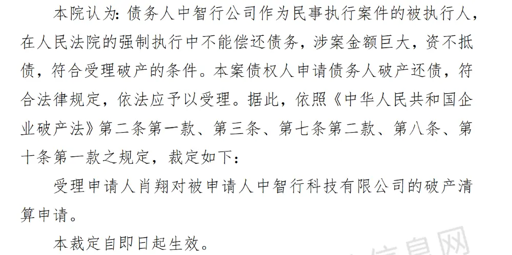 同时,经过法院调查,中智行涉及多件执行不能案件,涉案金额巨大,资不抵债,符合受理破产的条件,依法予以受理。