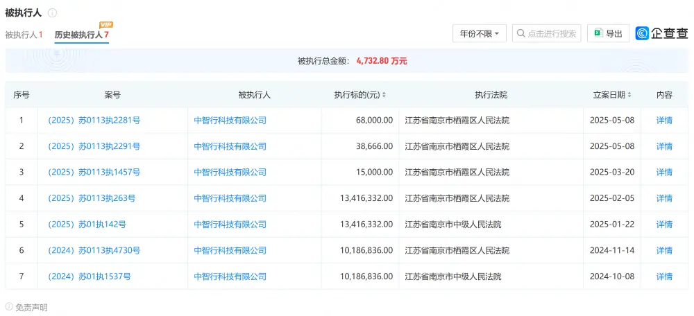 根据企查查上公开的数据,中智行在有关合同纠纷、劳动争议等案件中作为历史被执行人的被执行总金额已经达到了4732.80万元。