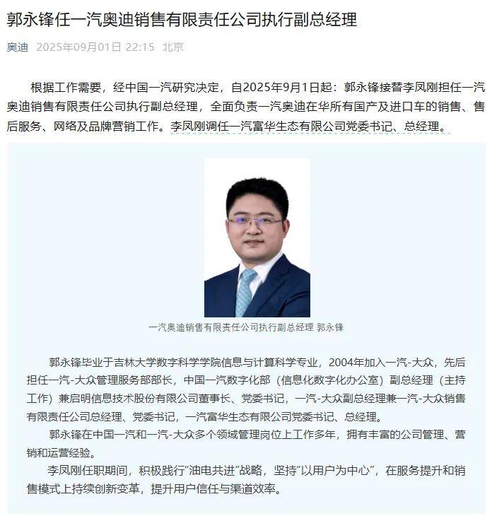 一汽奥迪中方一把手迎来换帅,可以说是近段时间以来关注度极高的人事变动事件之一。9月1日晚,一汽奥迪发布推文:郭永锋接替李凤刚担任一汽奥迪销售有限责任公司执行副总经理,全面负责一汽奥迪在华所有国产及进口车的销售、售后服务、网络及品牌营销工作。而李凤刚调任一汽富华生态有限公司党委书记、总经理。