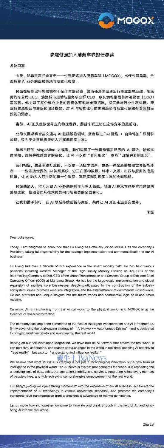 据信中表示,付强在智能出行领域拥有十余年丰富经验,曾历任滴滴品质出行事业部总经理、网约车公司CEO、城市运输与服务事业群CEO,以及满帮集团首席运营官等职务。他主导了多个核心业务的规模化落地与全球拓展,深度参与行业生态构建、跨业务资源整合与商业化闭环搭建。