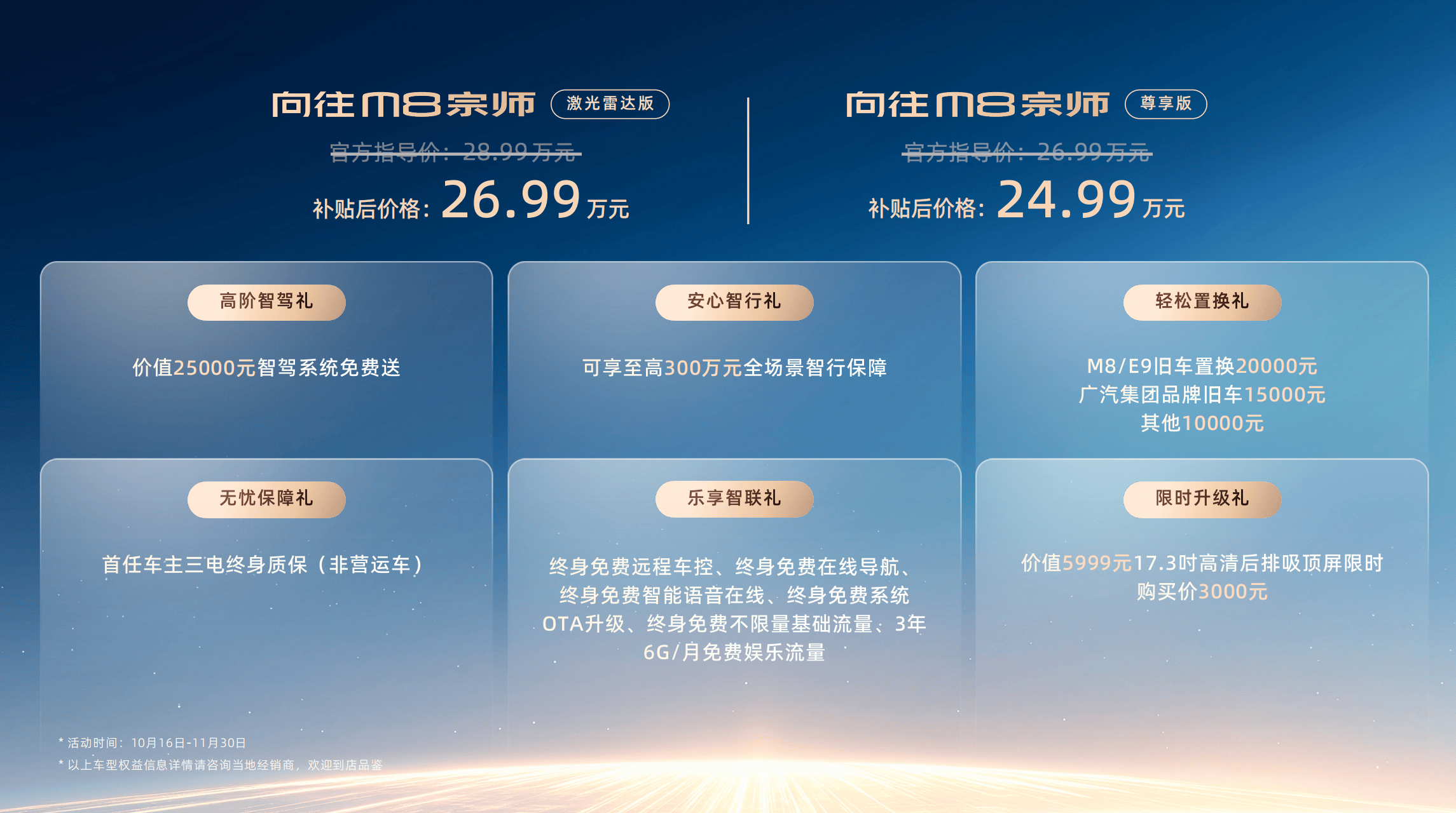 10月16日,2025中国国际新能源和智能网联汽车展览会上,广汽传祺向往车系再添重磅新作——向往M8宗师正式上市。这款被寄予“经典之上再造标杆”厚望的豪华MPV,官方指导价26.99万元起,叠加限时综合补贴后,入门价低至24.99万元;同时推出六大购车权益,包括M8/E9旧车置换最高享2万元补贴、激光雷达版免费获赠价值2.5万元智驾系统、首任车主三电终身质保,以及至高300万元全场景智行保障等,权益有效期覆盖10月16日至11月30日。