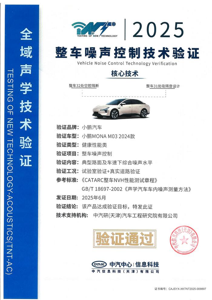 近日,小鹏MONAM03荣获中国汽车技术研究中心(以下简称“中汽研”)颁发的《整车噪声控制技术验证》认证,成为首个通过该项认证的车型。这项认证不仅是对MONAM03整车静谧性的权威背书,也标志着小鹏MONA在健康座舱、舒适驾乘领域的研发实力再次获得行业认可。