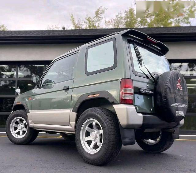 车身侧面,紧凑的车身尺寸与吉姆尼有着相似的小巧灵活感,但帕杰罗io在此基础上展现出更强大的气场。高高隆起的轮拱搭配大尺寸越野轮胎,彰显出它的越野实力。轮胎的花纹设计经过精心调校,能适应各种复杂路况,为车辆提供强大的抓地力。车尾部分,简洁干练的设计风格与整体相呼应,外挂式备胎是硬派越野的标志性元素,进一步强化了它的越野属性。