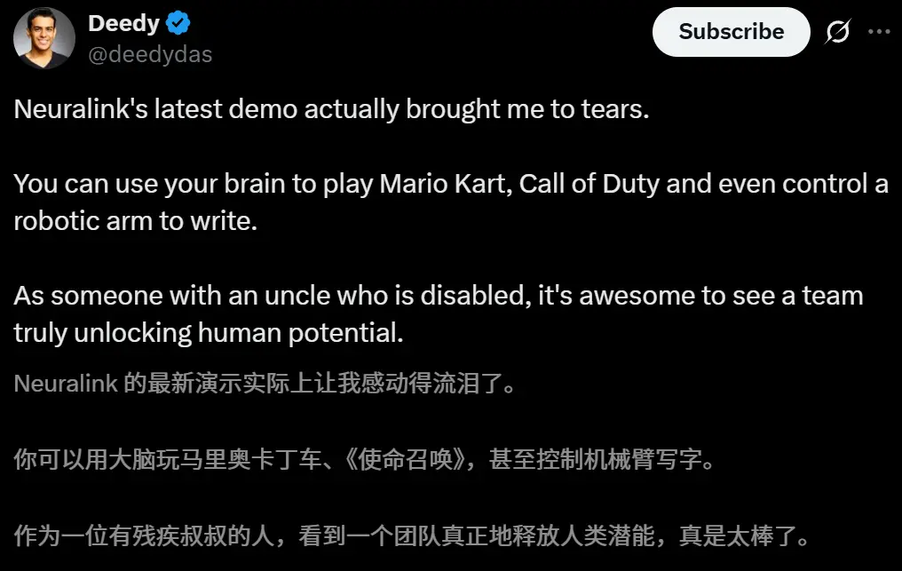 硅谷VC Deedy表示,这些演示真的让自己感动落泪,因为自己残疾的叔叔有希望了。