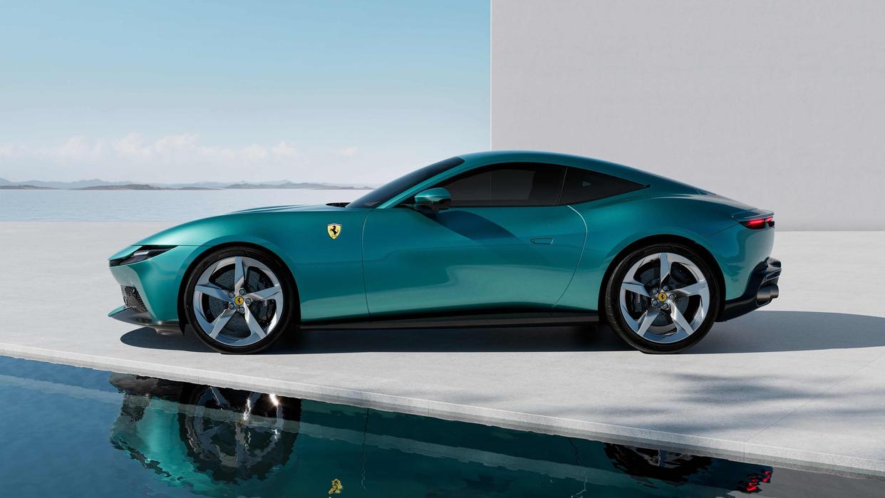 车身侧面,新车保留Roma的溜背线条,轮拱塑料饰板改为可选车身同色,标配 20 英寸轮毂(可选装倍耐力 P Zero 或普利司通 Potenza Sport 轮胎)。尺寸方面,新车长宽高分别为4660/1974/1301mm,轴距为2670mm。