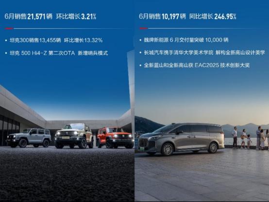 再比较值得一说的是长城,坦克继续发挥了自己在硬派越野细分市场的优势,坦克300 6月份卖出了13455辆,单车型销量环比增长了3.21%,这放在硬派方盒子里是非常棒的月销了,并且魏牌6月份销售10197辆,同比增长246.95%,能有这样的增长全新蓝山和高山功不可没。