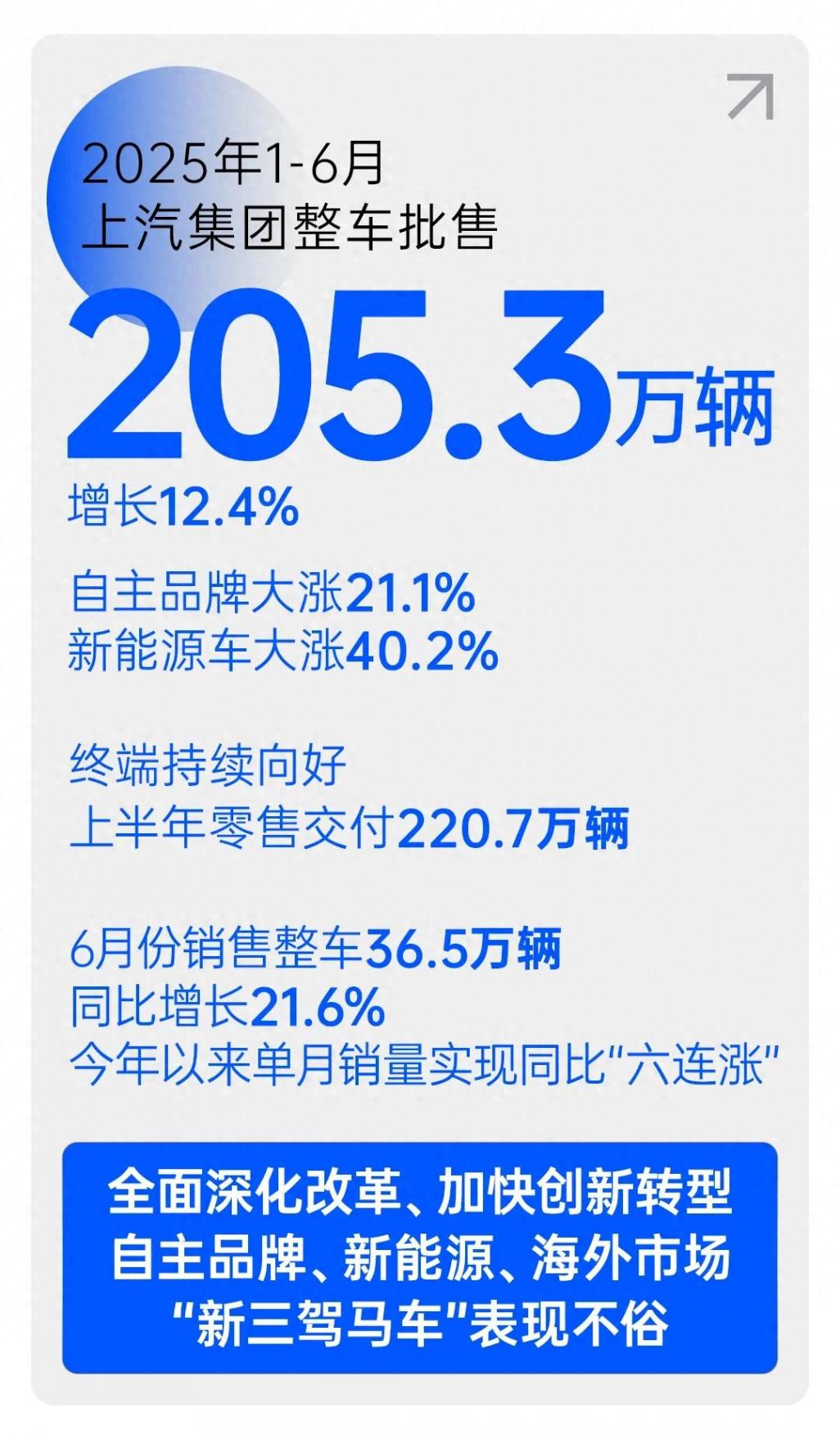 2025年上半场汽车江湖战况揭晓,上汽集团直接甩出王炸成绩单:1-6月终端零售交付超220.7万辆,单月销量同比“六连涨”,6月更是狂卖36.5万辆,同比飙升21.6% !