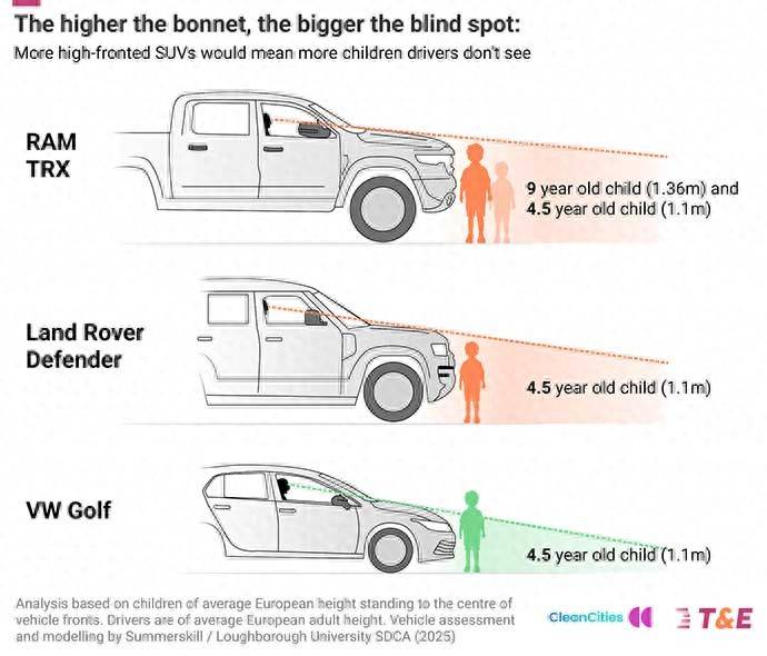 T&E 车辆政策主管詹姆斯・尼克斯表示:“较高的引擎盖对道路上最弱势的群体构成了严重威胁,驾驶员看不到孩子的车辆在城市里行驶,这一现实令人担忧。”