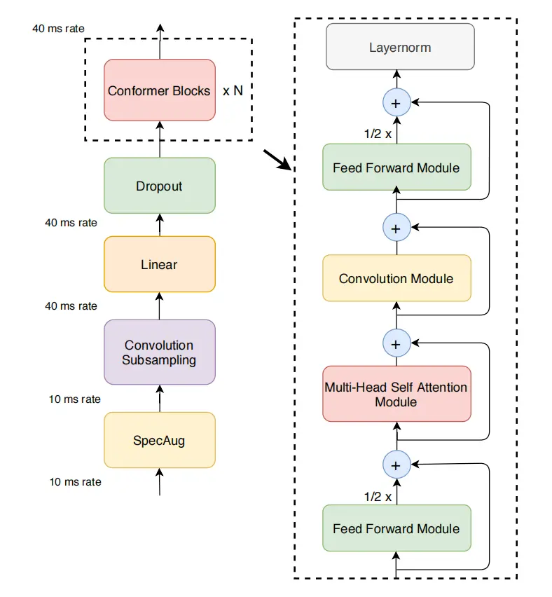 Conformer模型在模块设计上展现出诸多创新。其多头自注意力(MHSA)模块引入了Transformer-XL的相对正弦位置编码方法,显著提升了模型对不同长度语音输入的适应能力;卷积模块以点卷积和门控线性单元(GLU)为起点,结合一维深度卷积层,有效捕捉语音的局部特征;前后两个前馈模块则采用Macaron-net风格的半残差结构,进一步增强了模型性能。