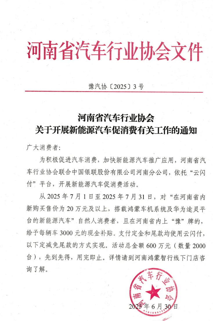 2025年6月30日,河南省汽车行业协会发布了一个通知,开展新能源汽车促消费活动,每辆车给予3000元现金补贴,数量2000台,共计600万元,先到先得,用完即止。购车时间限定在7月1日—31日。