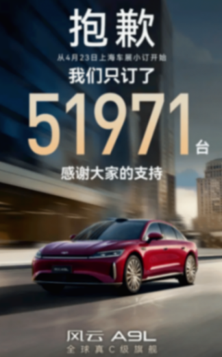 此后,奇瑞汽车谦逊地推出了一张道歉海报,表示风云A9L从4月23日首发亮相到6月26日开启预售,只拿到了51971台订单。