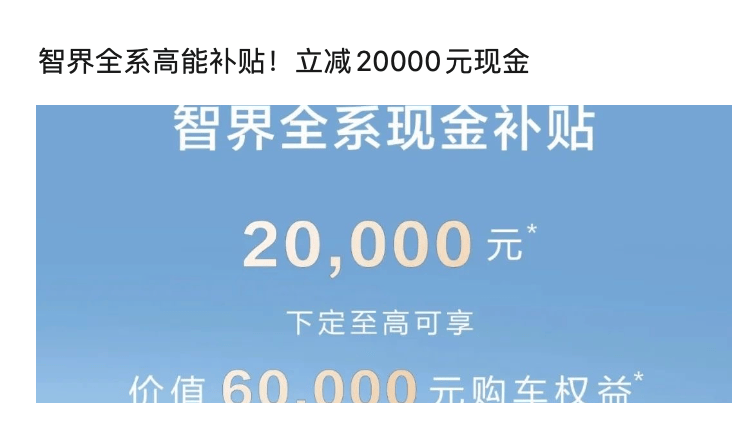 此前,6月26日上午,鸿蒙智行发布消息:全系车型提供2万元现金补贴,当日起下订至高可享价值6万元购车权益。降价后,的起售价降至20.98万元,智界R7的起售价降至22.98万元。