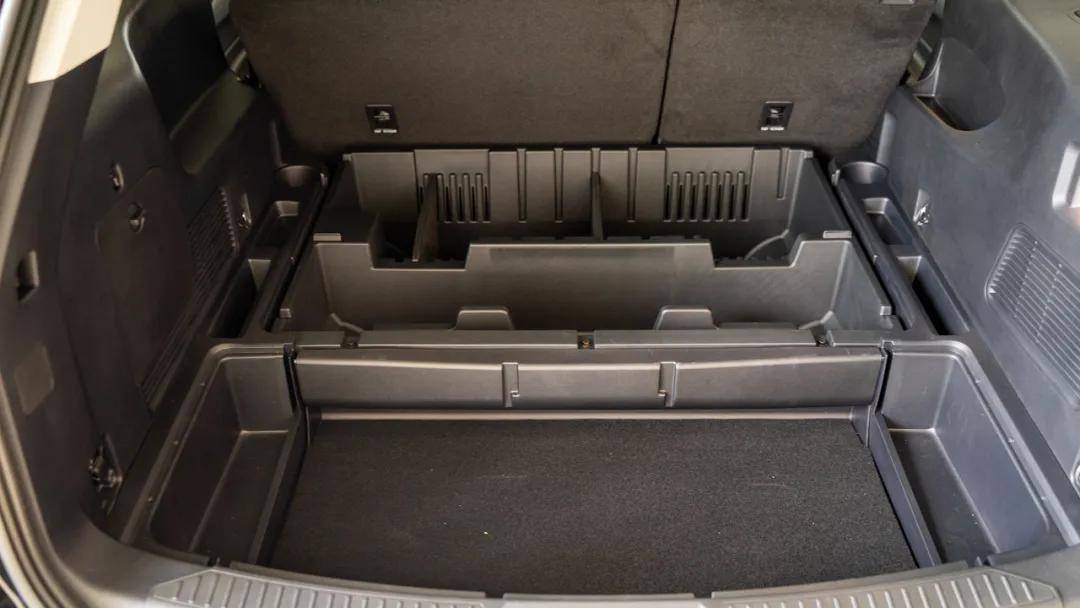 得异于5座的座椅布局,全新探险者四驱穿越版的后备厢可谓是非常巨大。即使不放倒第二排,满足4-5人的近郊出游甚至是露营都已经完全没有问题了。将四个盖板拿下后,下方还拥有非常多的“私密”空间,并通过塑料隔断进行了分区。