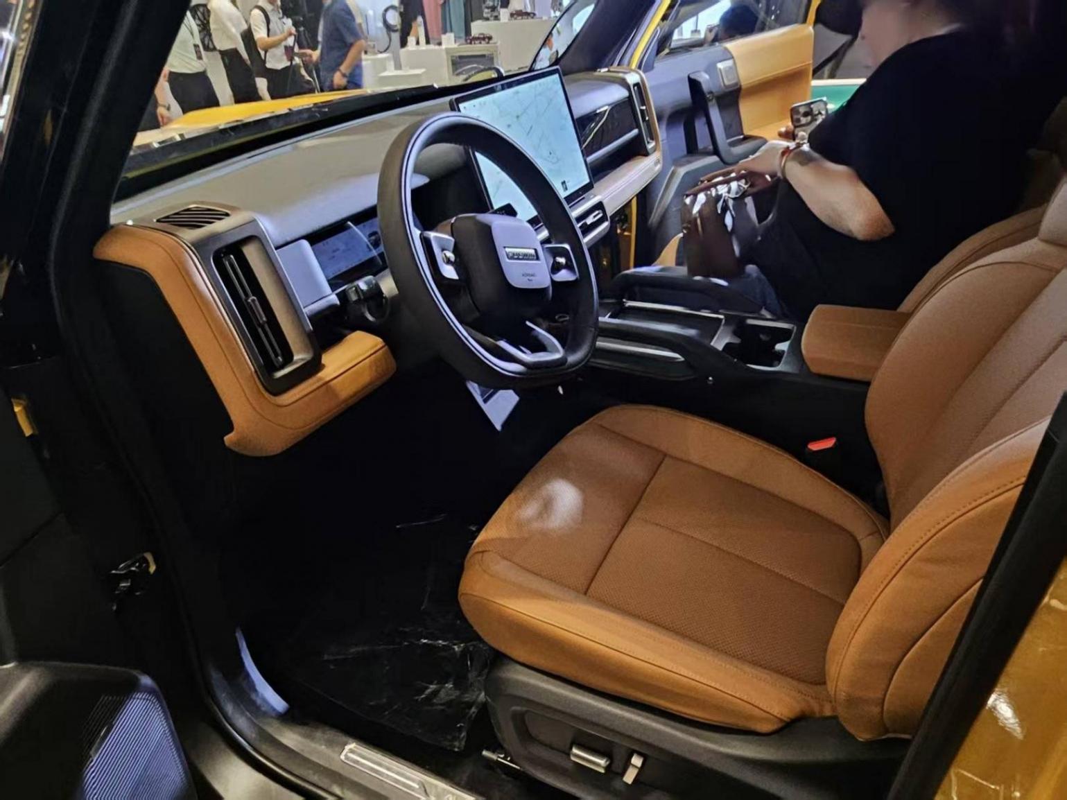 车内采用硬派风格设计,通过直线条设计和拼色勾勒,几乎看不到多余的物理按键。在配置方面,新车配备了全液晶仪表+大尺寸中控屏幕,三幅式方向盘采用皮质包覆,按键采用滚轮设计。