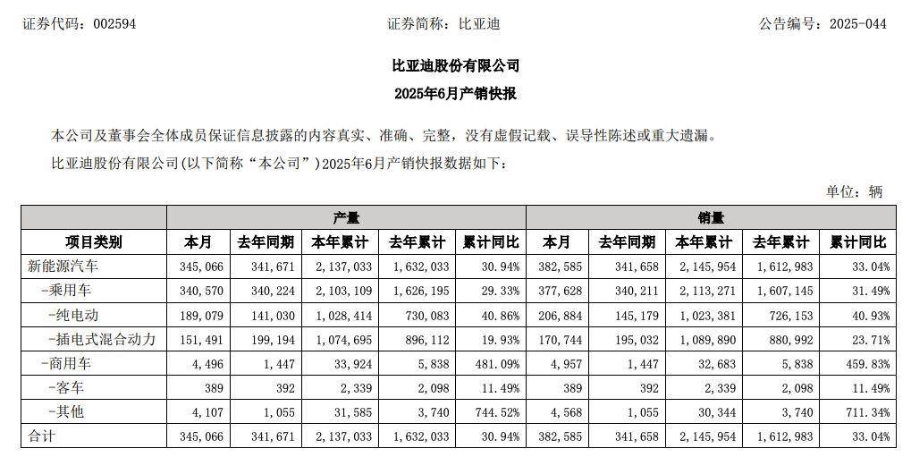 6月,比亚迪新能源汽车全球销量约38.26万辆,同比增长11.98%。按照规划,比亚迪2025年销量目标为550万辆。今年上半年,比亚迪新能源汽车累计销售约214.6万辆,完成年度销量目标近40%。