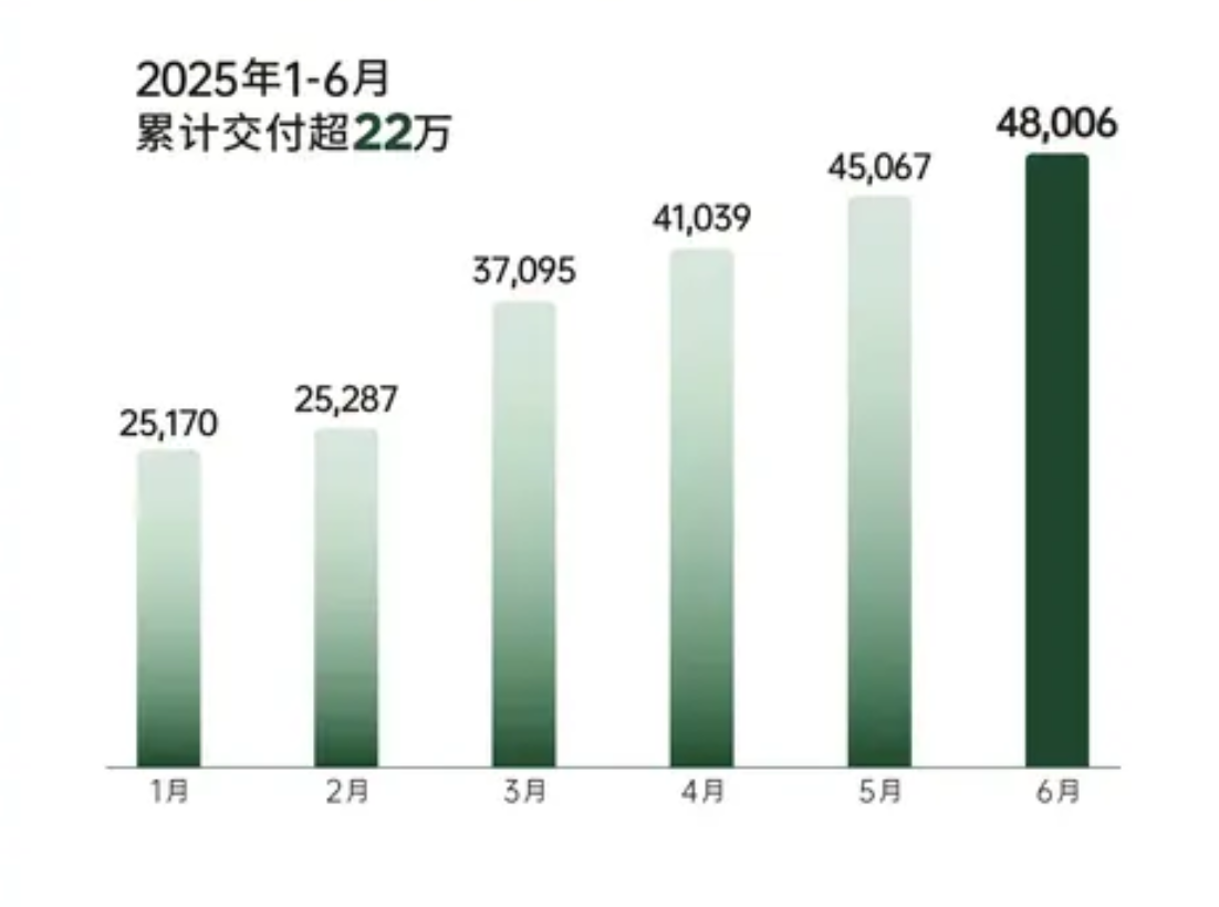 2025年上半年,零跑汽车以221,664辆的累计交付量稳居中国造车新势力品牌首位,同比增长156%,连续4个月蝉联月度销冠,并突破累计交付80万辆里程碑。不过,距其为自己定下的50万-60万辆年度销量目标仍有不小的距离。