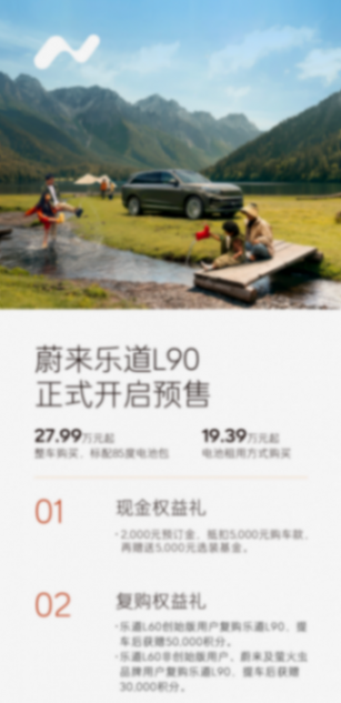 7月10日当晚,伴随着蔚来乐道L90产品技术发布会直播的结束,乐道L90预售开启的消息也正式落地,整车购买27.99万起,电池租用方式购买19.39万起!现在下订,即可享2000元预订金抵扣5000元购车款,再赠送5000元选装基金。而景枫中心的活动将持续至7月13日,消费者们可随时前往进行深度体验。