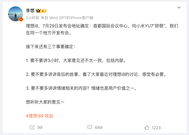 作为品牌首款纯电SUV,理想i8无疑肩负着开拓新领域的重任,CEO李想本人甚至在18号征求大家意见,要不要讲3小时,以及背后的故事等,因此信息量和对品牌的重要性无疑是非常大的。