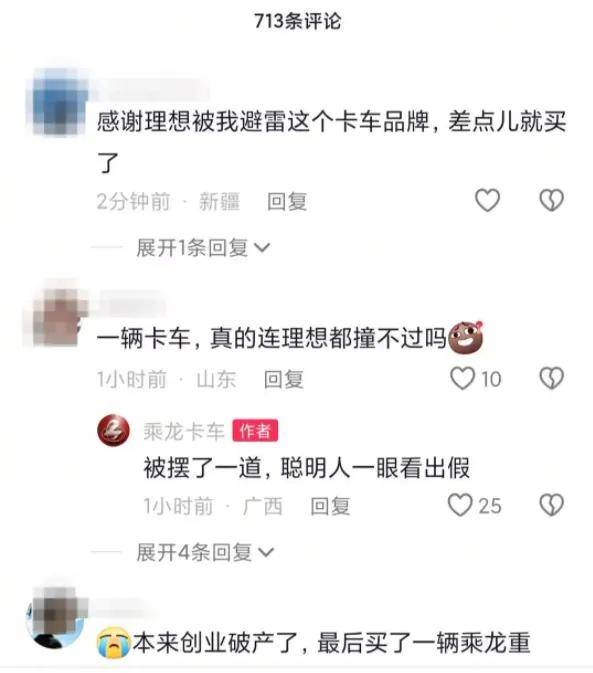 发布会过后,不少网友前往乘龙卡车官方抖音号留言。面对网友的质疑,乘龙卡车官方抖音回复网友表示法务部门正在处理中。从留言中,也能看出乘龙卡车对于该测试是不认可的,其称:“被摆了一道,聪明人一眼看出假。”“不知道背后导演想啥,实际碰撞你觉得会怎么样?”,这些回复为这一场“闹剧”再添上了一把火。