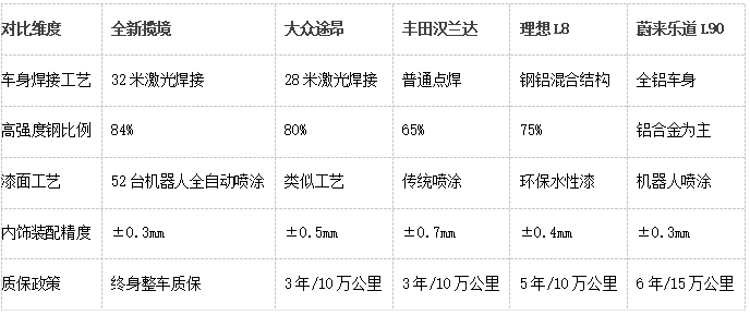 与同级别竞品相比,全新揽境在制造工艺上展现出明显优势。相较于美系竞品,德系车的装配精度和内饰做工更为精细;相较于日系竞品,德系车的车身刚性和底盘调校更具质感;相较于国产新势力品牌,德系车的长期可靠性和耐久性更值得信赖。这种制造优势在实际使用中转化为更扎实的行驶质感、更静谧的车内环境以及更长久的使用寿命,正是理性消费者所看重的核心价值。