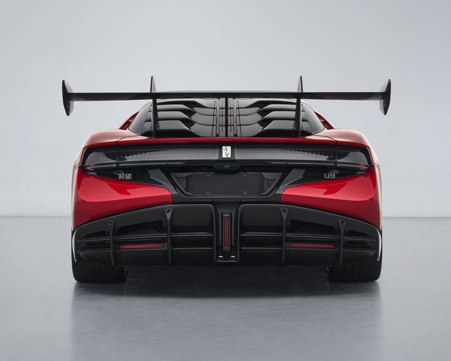 新款车型在外观设计方面并没有太多变化,申报车辆采用红色涂装,标配了碳纤维车顶和碳纤维固定式大尾翼,并且可以选装增强型碳纤维大前铲和碳纤维标准前铲,电动尾翼也可作为选装配置。U9赛道版采用325/35ZR20(112Y)的前后轮胎尺寸,相比在售版本在前胎尺寸上有所增加。