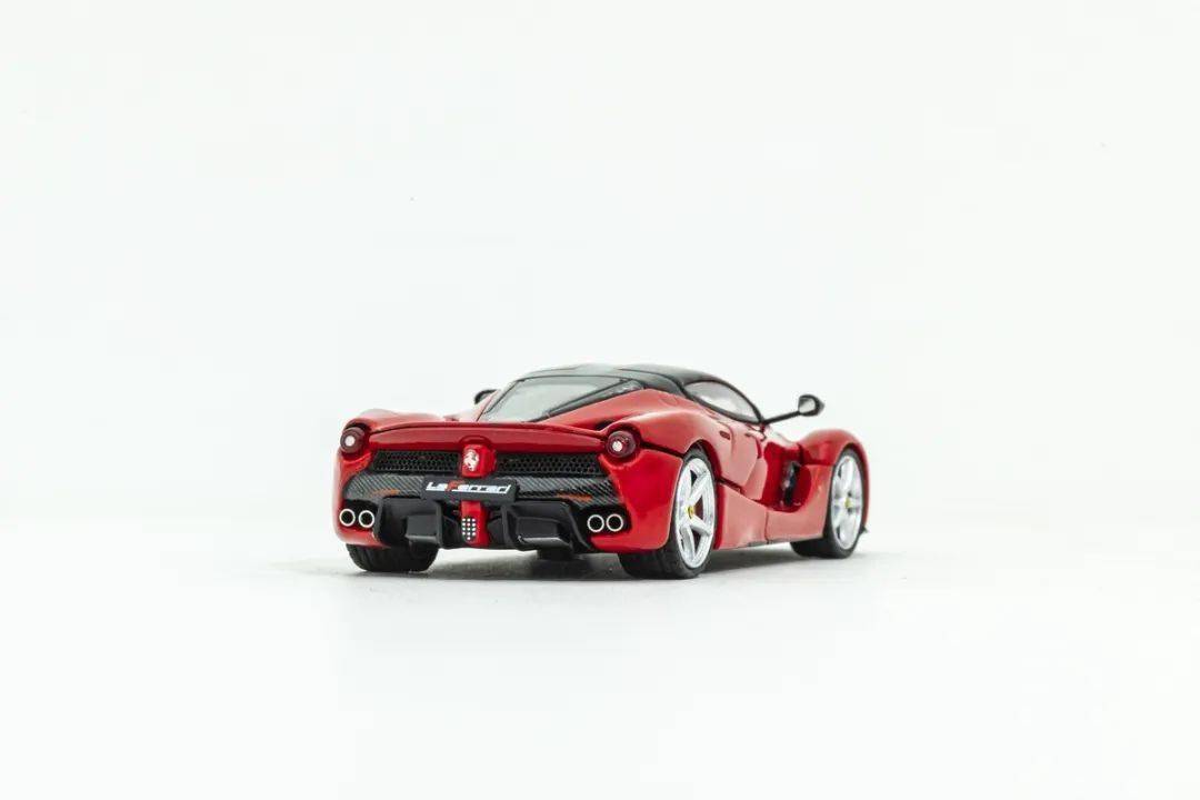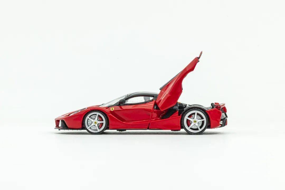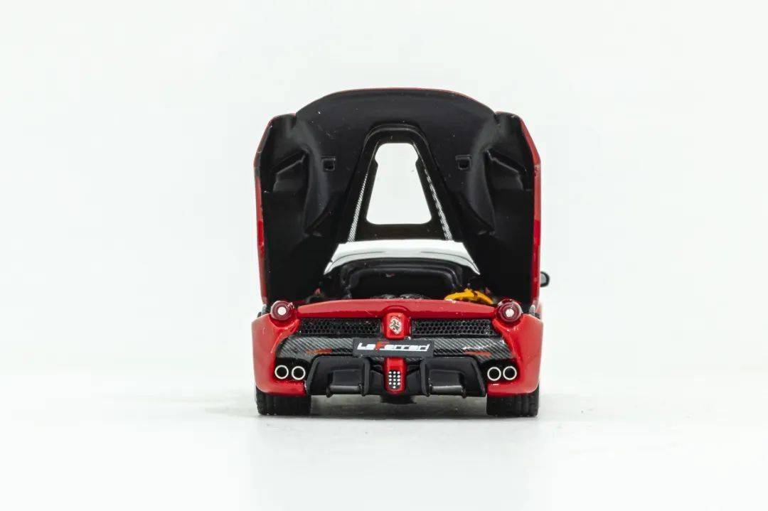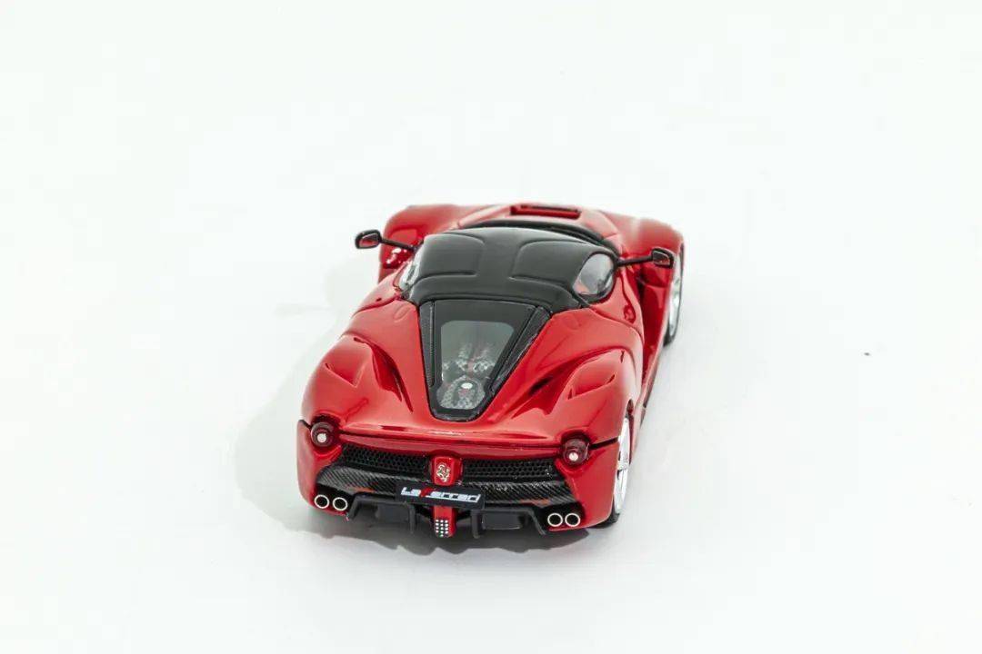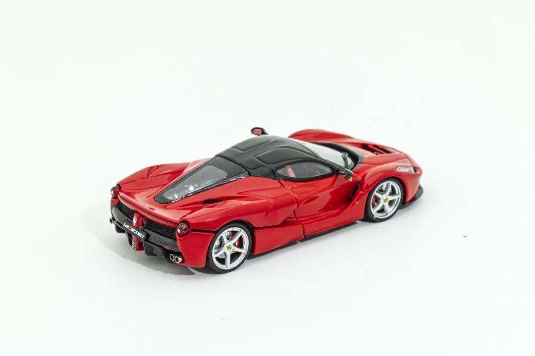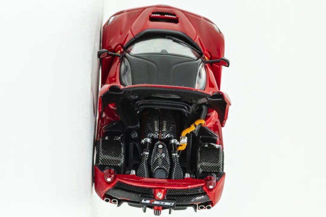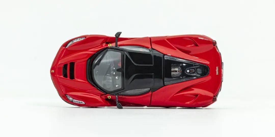 对比真车,虽然透视关系略有不同,但是整体形准还是很到位;拉法为中置引擎架构,车头依然很长,其实这个和拉法设计参考F1有很大关系;红色的素漆很符合法拉利的本质,漆面质感还是很好的;模型侧面的各种通风口有些是真实镂空的,有些是浮雕刻画的,但看起还是很逼真的;侧面的法拉利跃马标应该是贴纸的,车窗边框为黑色,车外后视镜为独立分件;前后盖因为都是可分离设计,缝隙都稍显大(真车也是有较明显缝隙的);不过还是要说一下这款拉法有溢胶及各种漆面小瑕疵,品牌方还是要尽量提高品控。