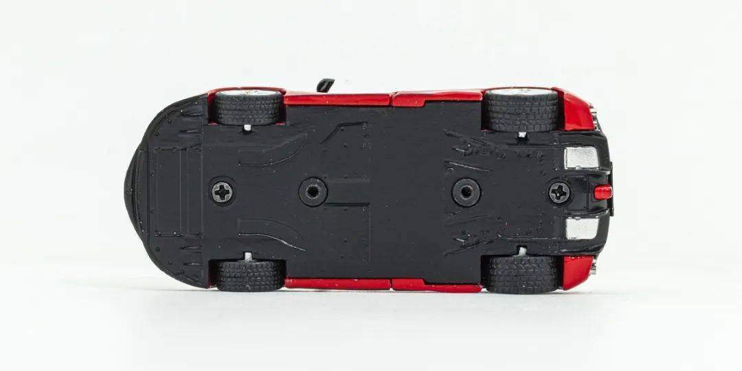 模型的悬挂比较低,轮毂为拉法的原厂银色轮毂,轮毂中央也有移印的跃马标,刹车系统也是高度还原的,包括刹车碟和红色刹车钳。