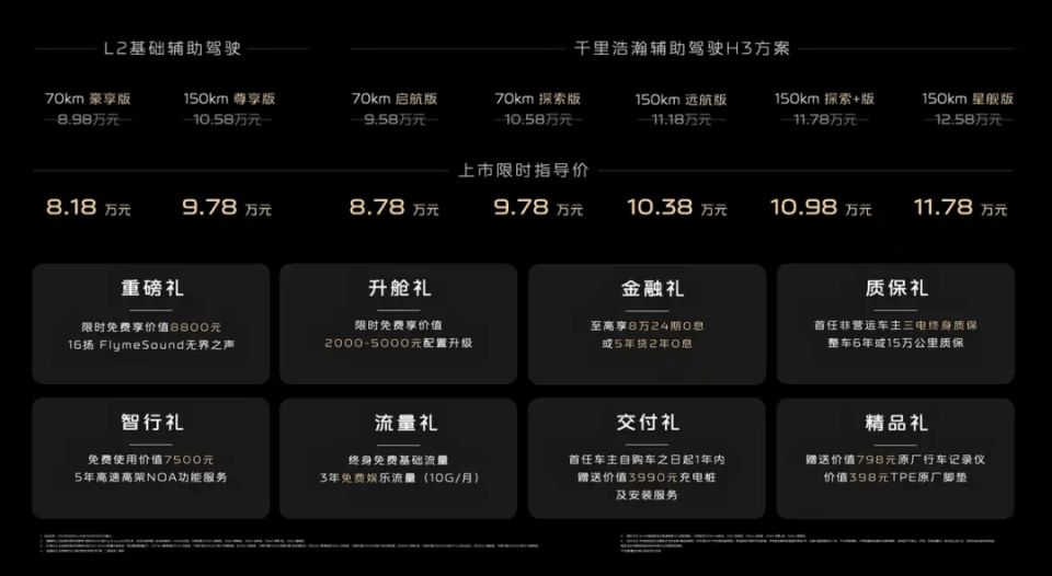8月8日,吉利银河A7正式发布上市,共推出7款车型,官方售价区间为8.98-12.58万元,限时指导价8.18-11.78万元。新车基于GEA新能源架构打造的插混轿车,采用全新设计,全新银河Flyme Auto智能座舱系统。下面,和大家一起来看看新车的产品力如何?