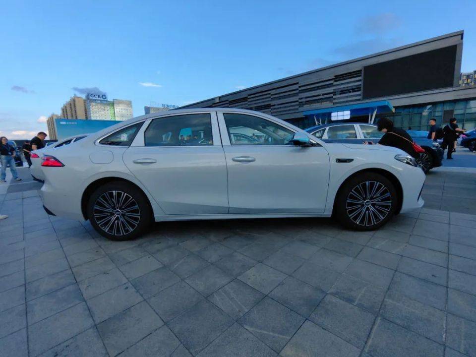 来到车身侧面,采用溜背式车顶线条,一体贯穿式肩线设计,使用传统式门把手,俯冲式的腰线,车窗相对狭长。根据车型不同,提供17英寸多辐轮圈、18英寸低风阻轮圈和19英寸多辐轮圈三种选择。车身尺寸方面,新车长宽高分别为4918/1905/1495mm,轴距2845mm。新车风阻系数仅为0.229Cd。