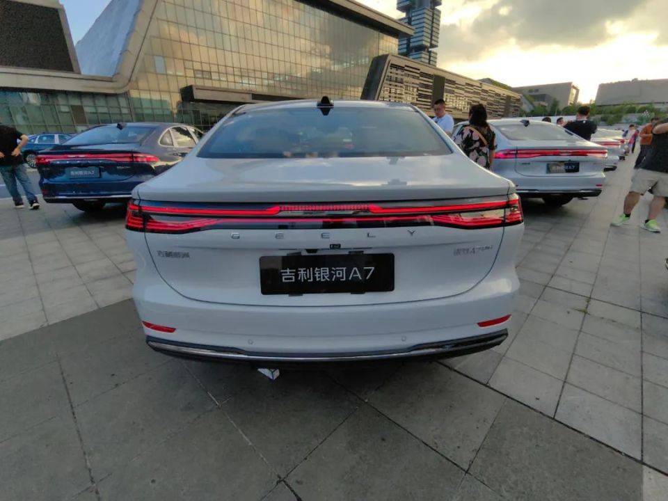 车身尾部,采用“旭日东升”贯穿式尾灯设计,车顶上方的尾鳍天线、尾灯、GEELY标识,下包围熏黑处理,配合小鸭尾扰流板,左尾灯下方为吉利汽车标识,右尾灯下方为银河A7 EM-i标识,采用隐藏式排气管。