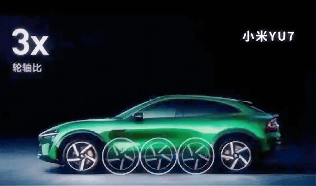 首先,轮轴比这个概念,其实是雷军第一次提出来的。小米的官方PPT也做了展示,在小米YU7的前后轮之间,塞进了3个轮胎,这大概就是雷军“3倍轮轴比”的由来。
