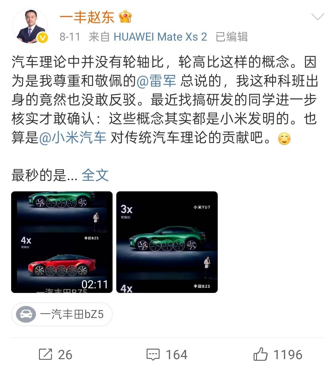 不过从结果来看,小米的宣传还是挺成功的,有不少车企都在效仿。包括指出错误的一汽丰田高管赵东,在指出错误后也立刻“找补”,表示雷总是商业天才,是他尊重和佩服的同行,但天才也会偶有失误的时候,自己要学习雷总的思想和方法论。