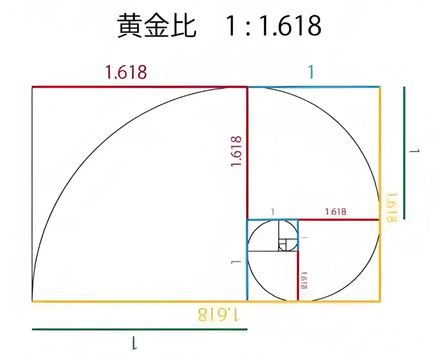 “黄金比例”这个概念来自于 “自我相似”的比例分割,就是把一个长段与一个短段连在一起,长段是整体的 0.618 倍,短段是长段的 0.618 倍,形成 “无限嵌套”。