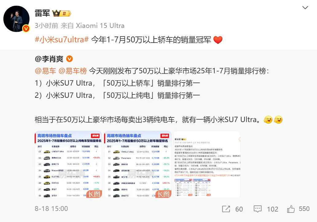 数据表明,在50万以上豪华纯电市场,每卖出3辆纯电车就有1辆是小米SU7 Ultra。这一成绩引发广泛关注,小米副总裁李肖爽、小米创办人&董事长兼CEO雷军纷纷在社交平台分享喜讯。