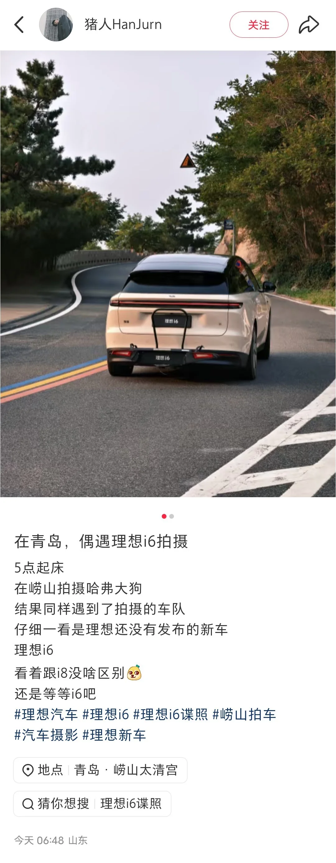 8月29日,小红书博主“猪人HanJurn”发文称,在青岛偶遇理想未发布的新车:理想i6,并表示“看着跟i8没区别。”