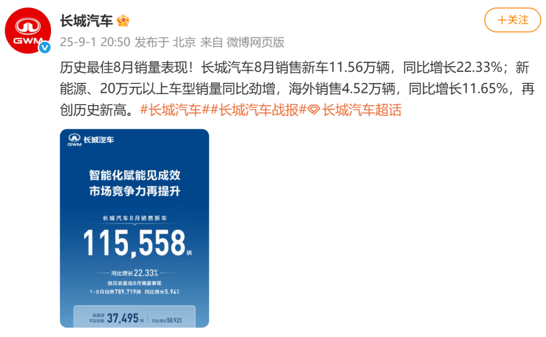 海外市场同样支撑了这一走势。8月出口4.52万辆,同比增长11.7%,前8月累计28.39万辆,占比超过三分之一。全球布局分散了国内竞争压力,让长城的销量更稳健。